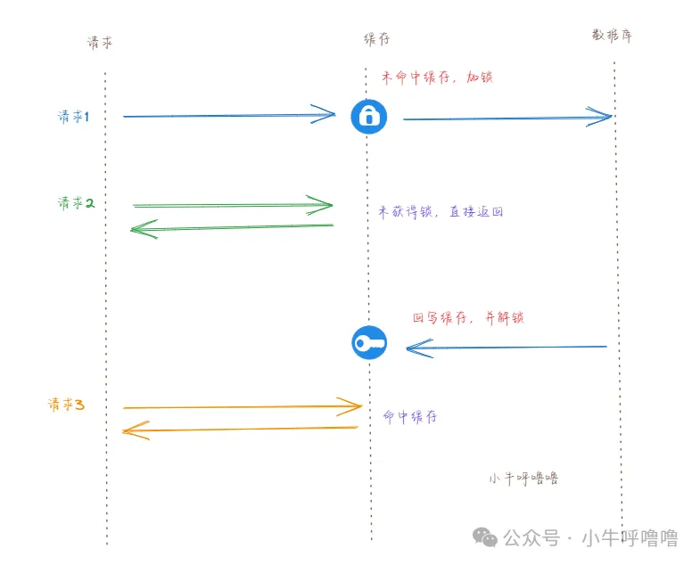 加锁,进程锁/分布式锁,当请求过来时,缓存未命中时,会通过锁将这个缓存key锁上,等当这个请求从数据库获取数据后再回写到缓存中后,再释放锁;期间其他请求过来,会获取锁失败,等待一段时间重试,就可以直接读取缓存了。需要注意的是,如果业务量不大,进程锁就够了的话,也就没必要上分布式锁,多引入额外组件,就会增加系统的不稳定性