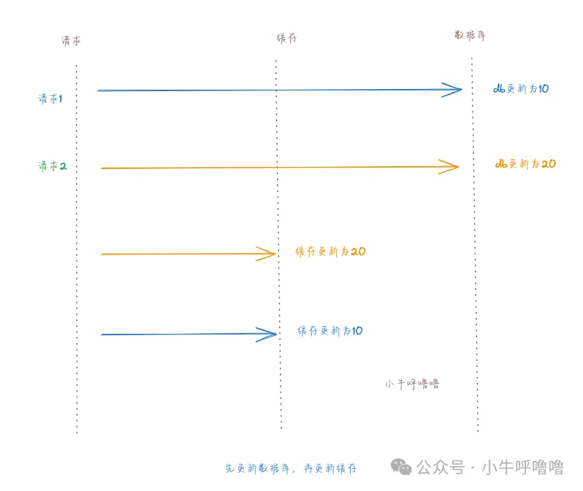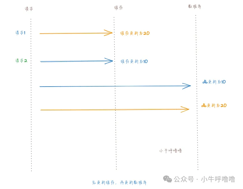 当请求(或者可以说线程)并发的情况,比如2个请求1、2同时去更新db时,请求1快一点;但当程序延迟或者其他情况,导致当请求去更新缓存时,请求2快一点,这就会导致最终db=20,缓存=10这种数据不一致的情况,不一致的情况将持续到下次缓存失效,或者去更新数据库缓存的时候,在此期间还不能保证更新缓存一定就可以成功