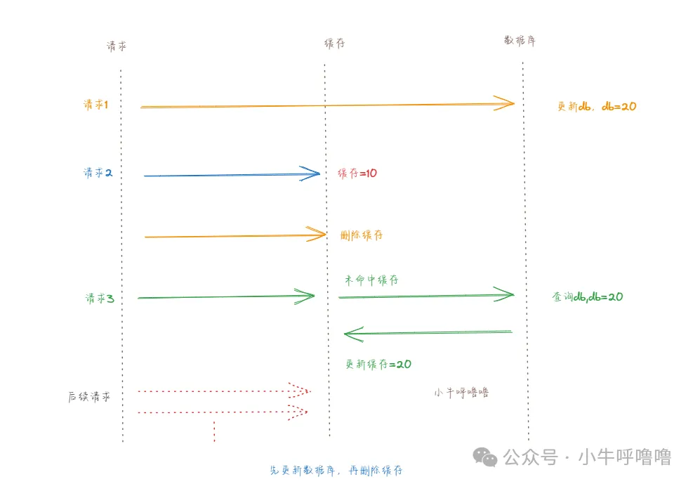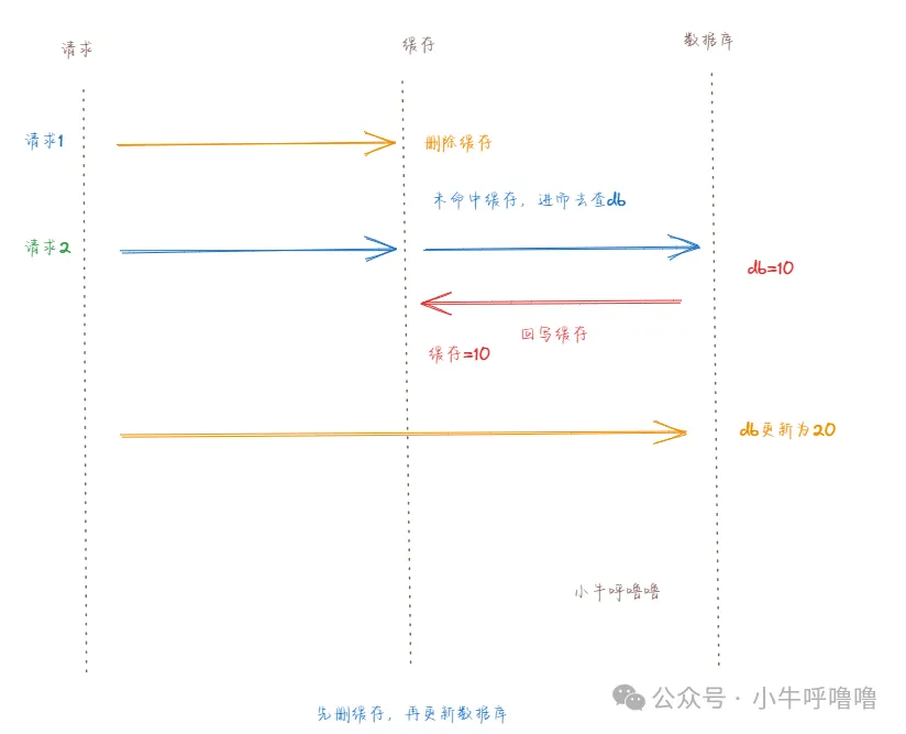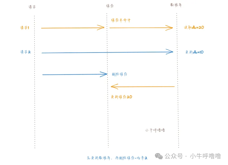 当2个并发请求过来,请求1是更新请求,当请求1删除调缓存后,还没去db更新数据,期间请求2来获取数据,缓存未命中(刚被请求1删了嘛),去数据库获取数据10后,后回写缓存,把缓存更新为10;这个时候请求1终于去更新db了,把db更新为20,这个时候还是会出现缓存和数据库不一致的情况