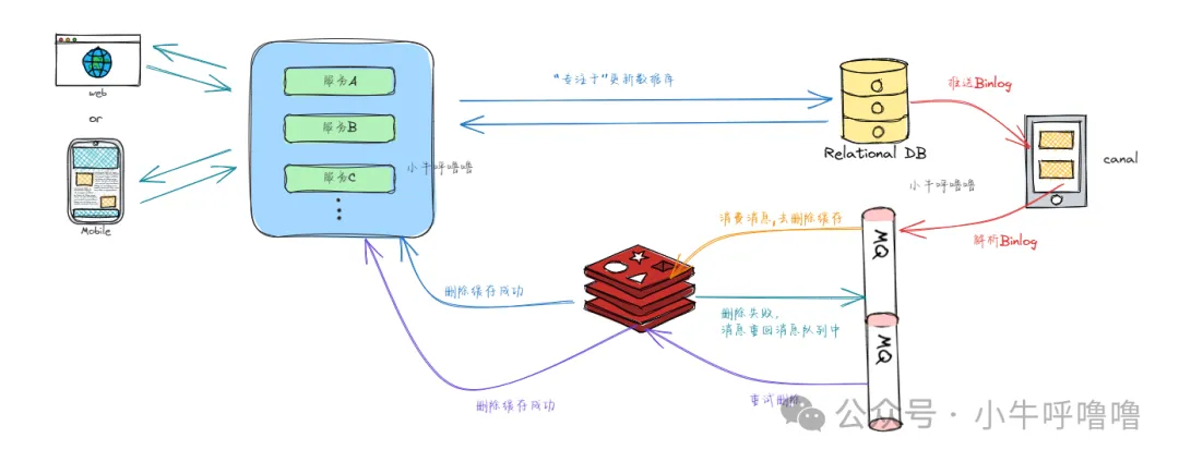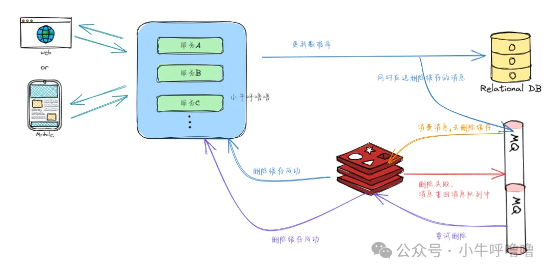 另外一般将更新数据库的模块和同时发生删除缓存消息的模块放在同一个服务里,因为这样后期维护起来,才不会发现莫名奇妙,不然就是给排查和维护上强度~~
