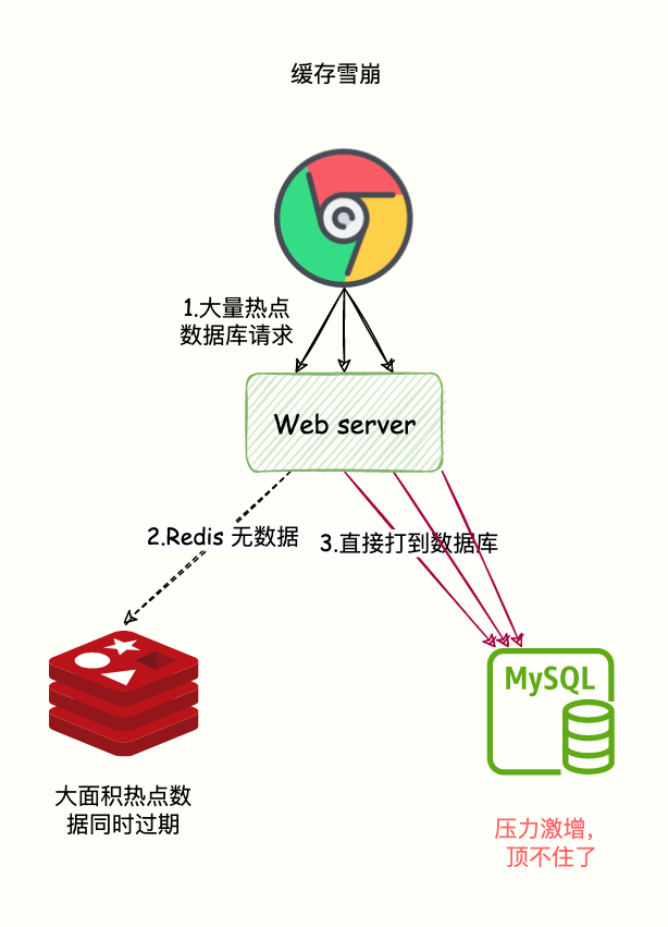 大量热点数据同时过期,导致大量请求需要查询数据库并写到缓存;Redis 故障宕机,缓存系统异常。缓存大量数据同时过期