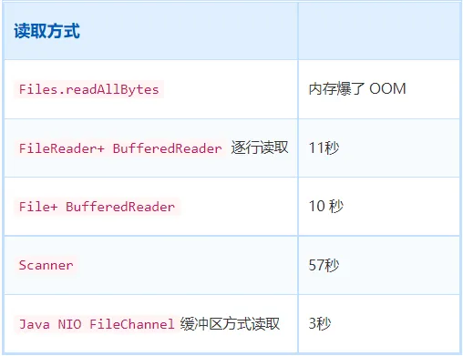Files.readAllBytes一次性加载内内存FileReader+ BufferedReader 逐行读取File+ BufferedReaderScanner逐行读取Java NIO FileChannel缓冲区方式读取在MAC上,使用这几种方式的读取3.4G大小文件的性能对比