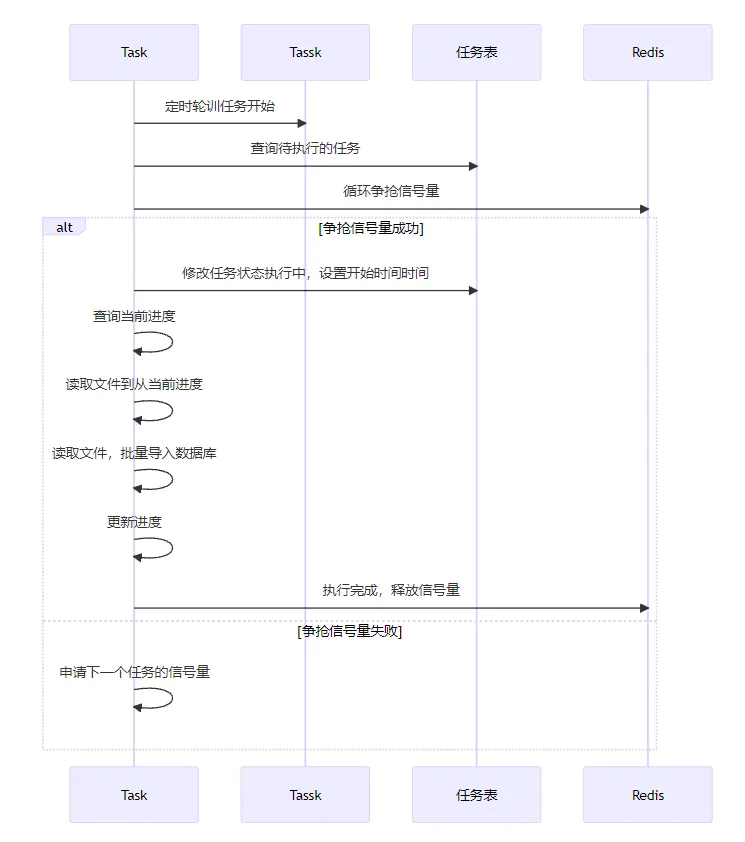 复制RedissonClient redissonClient = Redisson.create(config); RSemaphore rSemaphore = redissonClient.getSemaphore("semaphore"); // 设置1个并发度 rSemaphore.trySetPermits(1); rSemaphore.tryAcquire();//申请加锁,非阻塞。1.2.3.4.5.由任务负责定期轮训,抢到名额后,就开始执行任务。将该任务状态置为Process,任务完成后或失败后,释放信号量。