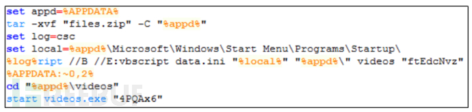 properties.bat 运行 data.ini 文件与解压后生成的 videos.exe 文件。前者为 VBS 脚本,会在 %AppData%\Microsoft\Windows\Start Menu\Programs\Startup\ 中创建 videos.exe 的快捷方式。