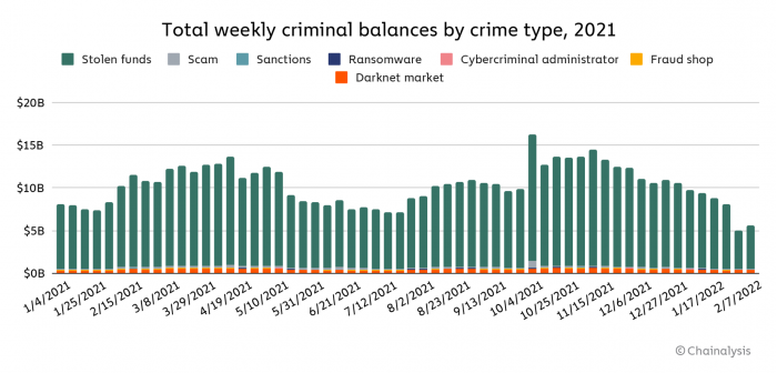 犯罪余额在全年也有波动,从7月的66亿美元的低点到10月的148亿美元的高点。这种波动提醒了加密货币调查中速度的重要性,因为在区块链上被成功追踪的犯罪资金可以被迅速清算。当然,犯罪余额的下降也可以有很好的理由。我们在上面看到的2022年2月犯罪余额的大幅下降是由于司法部扣押了2016年Bitfinex黑客攻击中被盗的36亿美元的比特币。IT技术网在这次扣押之后,截至2022年2月9日,犯罪余额目前大约为50亿美元。