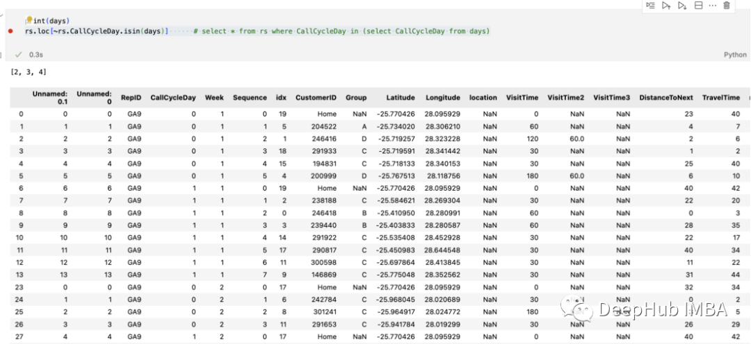 复制dfb = df.loc[(df.Week == week)|(df.Day == day)]1. 2、Select where in从一个df中选择一个包含在另外一个df的聊聊数据,例如下面的小技sql