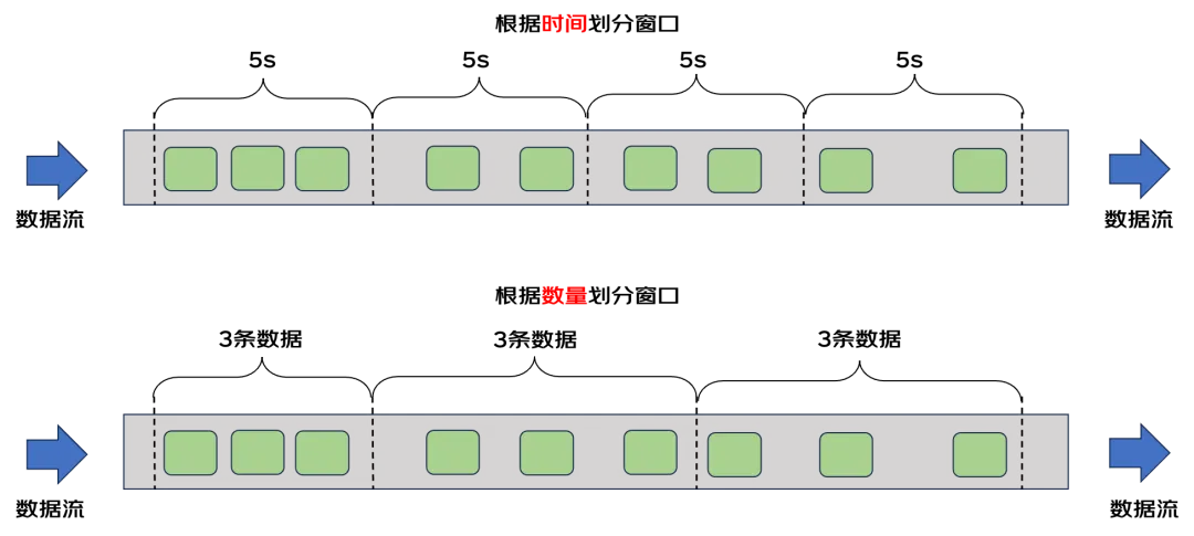 无界数据流本身没有边界,但是对数据流的计算需要一个明确的边界。这就要将无界数据流划分为有界数据流,边界的划分一般有两种方式:时间驱动或者数据驱动,时间驱动就是每隔多长时间就划分一个边界,数据驱动就是每来多少条数据划分一个边界。