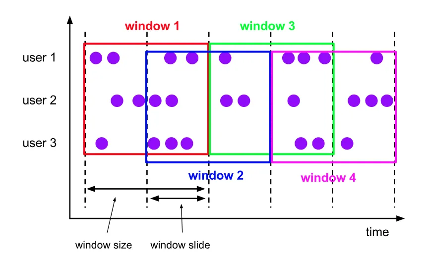 有了事件时间,基于窗口的聚合(例如,每分钟的事件数量)只是事件时间列上的一种特殊的分组和聚合。每个时间窗口是一个组,每一行数据可以属于多个窗口/组(针对滑动窗口,多个窗口可能有重合的数据)。