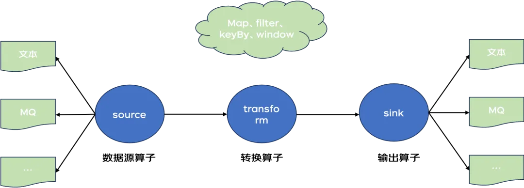 2.2.4 基于窗口机制的流计算算子模型Flink中算子分为数据源算子(source)、转换算子(transform)、输出算子(sink),下图为算子模型示意图。数据源算子负责接收运算数据,数据源支持多种:文本、MQ等等;转换算子主要对数据流进行聚合和计算操作;sink算子主要负责将运算结果输出,包括持久化和转发运算结果(MQ)等。