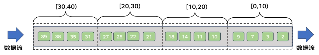 下图展示了用窗口大小为10s的滚动时间窗口处理数据的例子,数据流中所有数据都按序到达,这是最理想的情况。