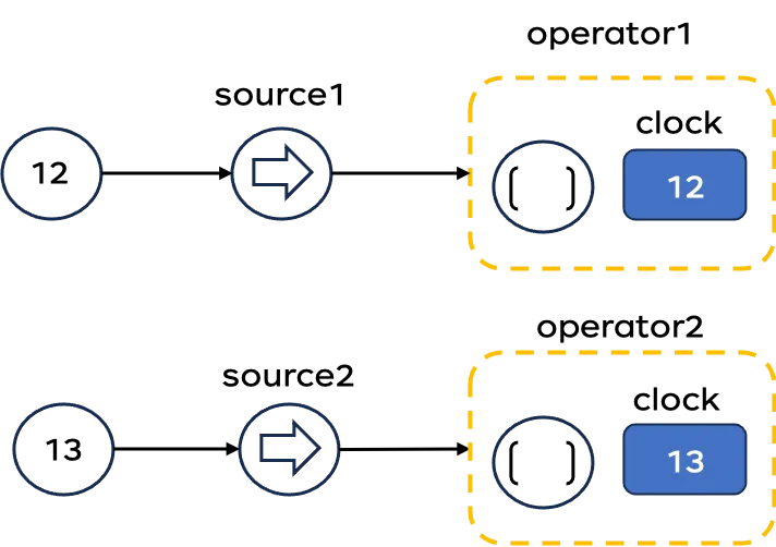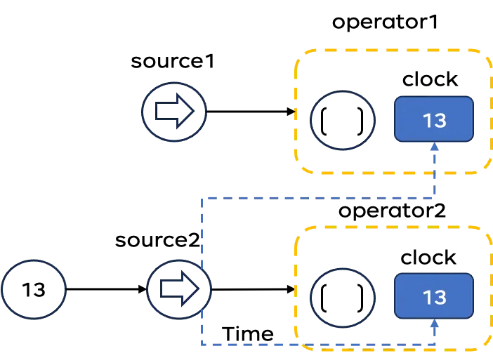 以下图为例,时间戳为12和13的数据分别进如source1和source2算子。source1算子将基于事件时间的逻辑时钟传递给下游operator1算子,operator1算子将本地逻辑时钟置为12;source2算子将逻辑时钟传递给下游operator2算子,operator2算子将本地逻辑时钟置为13。这就造成了不同下游节点之间逻辑时钟不统一的问题。