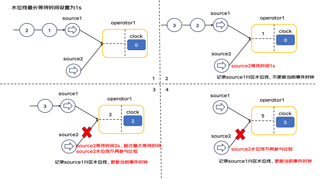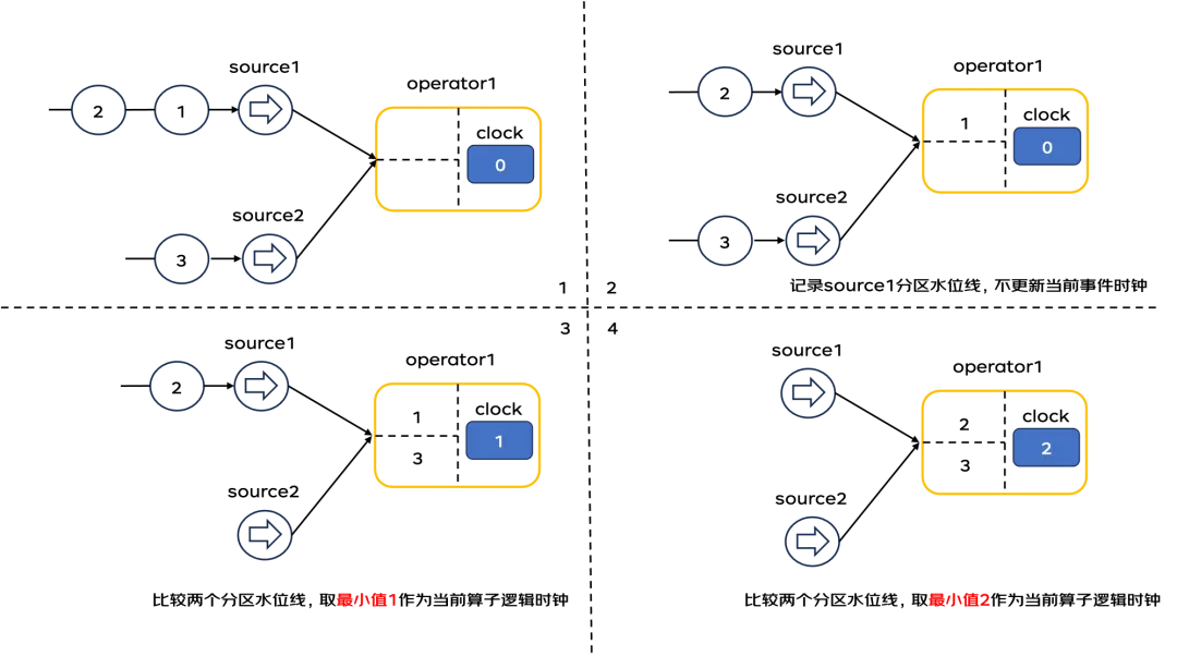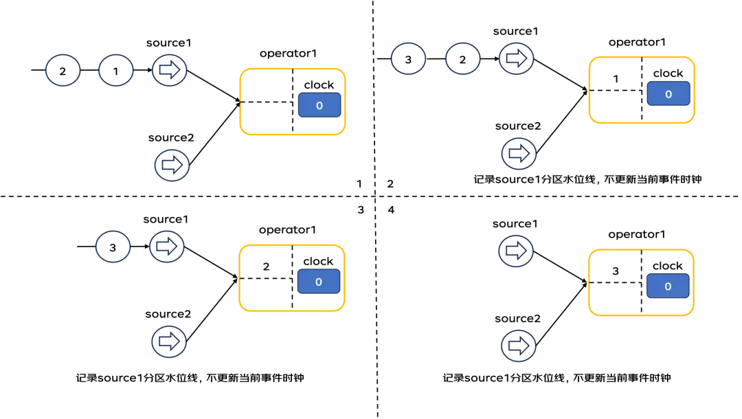 3)source2算子处理事件时间为3的数据,并将水位线3传递给下游operator1算子,operator1算子接收到source2的水位线之后,和source1分区的水位线1进行比较,取最小值[1]作为自己的逻辑时钟时间。