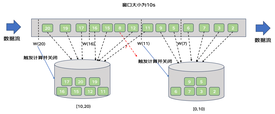 3)11进入到[10,20)窗口内后,又有一条数据8来到。此时属于它的窗口已经触发计算并关闭,不处理该条数据。