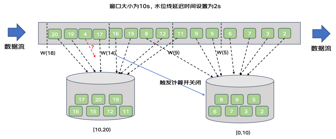 5)17-20这些数据进入到[10,20)窗口内,此时触发水位线计算,水位线为w(18),不触发窗口操作。其中乱序数据4无法处理。
