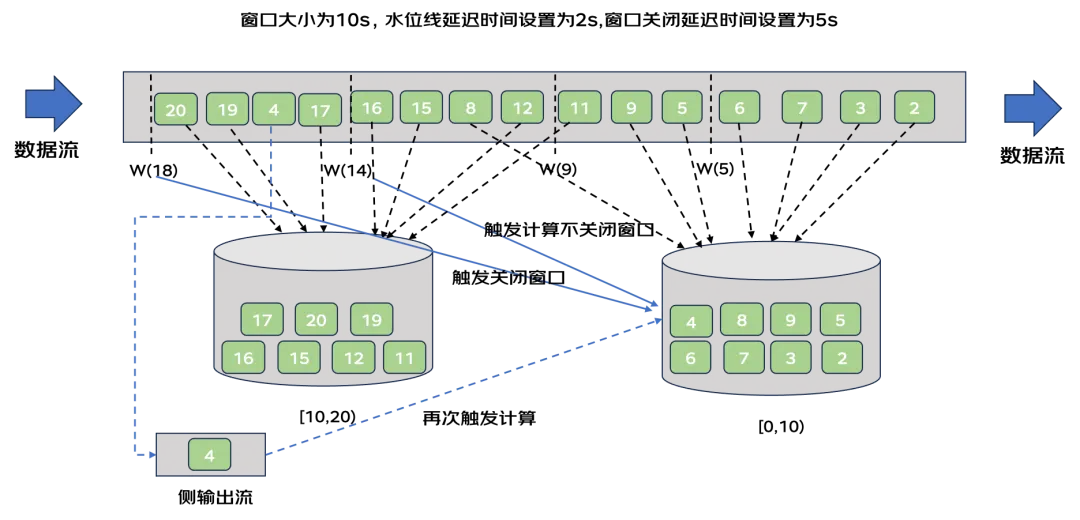 其实水位线触发窗口计算和关闭是两个动作,触发窗口计算之后如果窗口不进行关闭,那么延迟严重的数据还可以通过侧输出流进入到该窗口再次出发计算。Flink也支持设置窗口关闭延迟时间,将窗口关闭延迟时间设置为5s,以上图为例,再次进行数据流处理。
