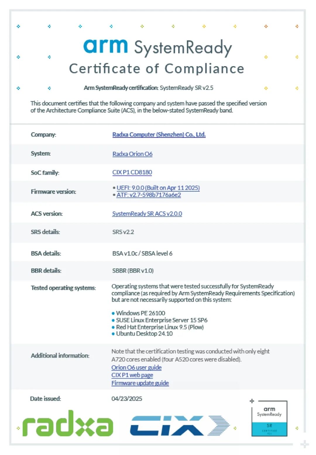 此芯科技和Arm在芯片硅前设计阶段就在芯片系统架构和启动相关方面进行了深入合作,以满足Arm SystemReady的要求。在早期阶段,通过ACS (Architecture Compliance Suite) 测试集进行测试验证,确保芯片设计和固件实现能够分别满足BSA (Base System Architecture) 以及BBR (Base Boot Requirements) 的标准。在瑞莎星睿O6 AI PC开发套件量产上市后,服务器托管此芯科技基于该平台积极启动Arm SystemReady认证测试工作。通过双方的共同努力,已基于UEFI+ACPI统一固件实现了Linux和WinPE等多种操作系统的无缝支持,达到了Arm SystemReady的认证要求。基于Arm SystemReady认证的固件,开发者可以轻松地安装各种标准的操作系统,这将进一步加速Arm PC在客户端的商业落地。
