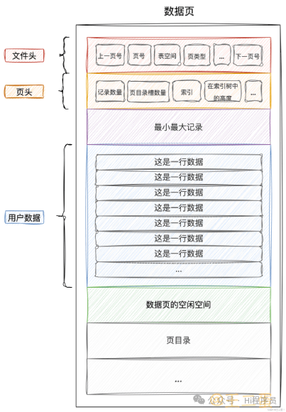 InnoDB页大小默认为16KB,「文件头」、「页头」、「页目录」等占用了1/16的空间,剩下的15KB就用来存行记录。