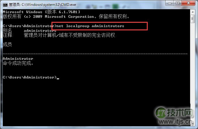 4、户查在命令提示符窗口中输入:net localgroup administrators 按回车键执行命令。