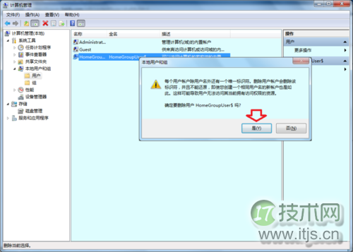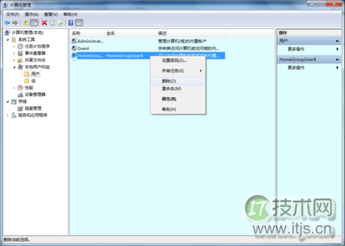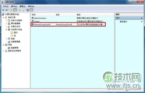 5、再去计算机管理→本地账户和组→用户→是否多出来一个账户名称后面带$的隐藏的账户(HomeGroupUser$)