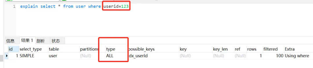 复制//userid 是varchar字符串类型 select * from user where userid =123;1.2.