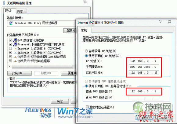 4.分机同样无线网卡属性里更改ipv4,解决与主机不同的常出现是IP该为192.168.0.X(X可以是除1以外的任何0~255的数),其他数值设置与主机一致
