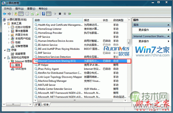 (1)右击我的解决电脑——管理——服务和应用程序——服务——Internet Connection Sharing (ICS)