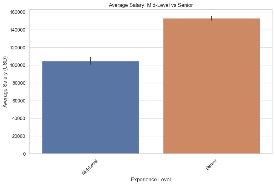 复制# 绘制中级和高级的图表 plt.figure(figsize=(10, 6)) sns.barplot(x=experience_level, y=salary_in_usd, data=mid_senior, estimator=lambda x: sum(x) / len(x) if len(x) != 0 else 0) plt.title(Average Salary: Mid-Level vs Senior) plt.xlabel(Experience Level) plt.ylabel(Average Salary (USD)) plt.xticks(rotatinotallow=45) graphs.append(plt.gcf()) plt.show()1.2.3.4.5.6.7.8.9.
