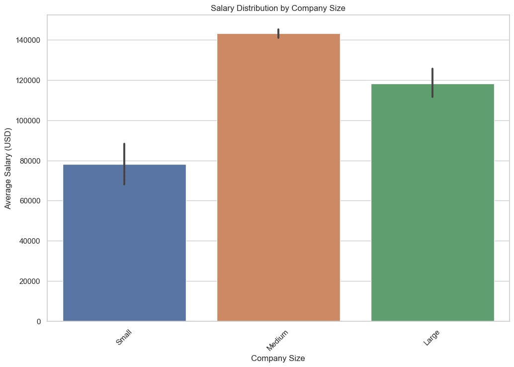 复制plt.figure(figsize=(12, 8)) sns.barplot(x=company_size, y=salary_in_usd, data=df, estimator=lambda x: sum(x) / len(x) if len(x) != 0 else 0, order=[Small, Medium, Large]) plt.title(Salary Distribution by Company Size) plt.xlabel(Company Size) plt.ylabel(Average Salary (USD)) plt.xticks(rotatinotallow=45) graphs.append(plt.gcf()) plt.show()1.2.3.4.5.6.7.8.以下是输出结果。